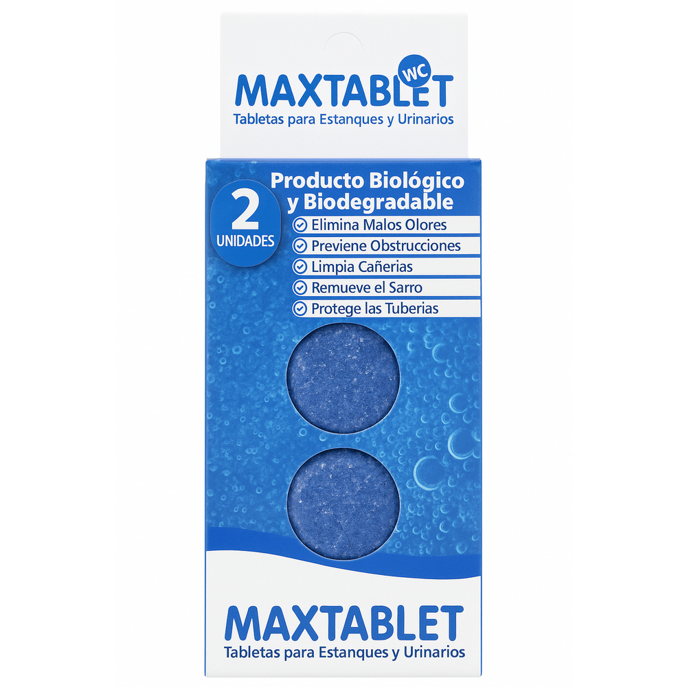 Las tabletas MaxTablet están diseñadas para mantener limpios y desodorizados los estanques y urinarios. Gracias a su acción prolongada, ayudan a prevenir malos olores, sarro y residuos, ofreciendo una solución higiénica y práctica para baños de alto tránsito.